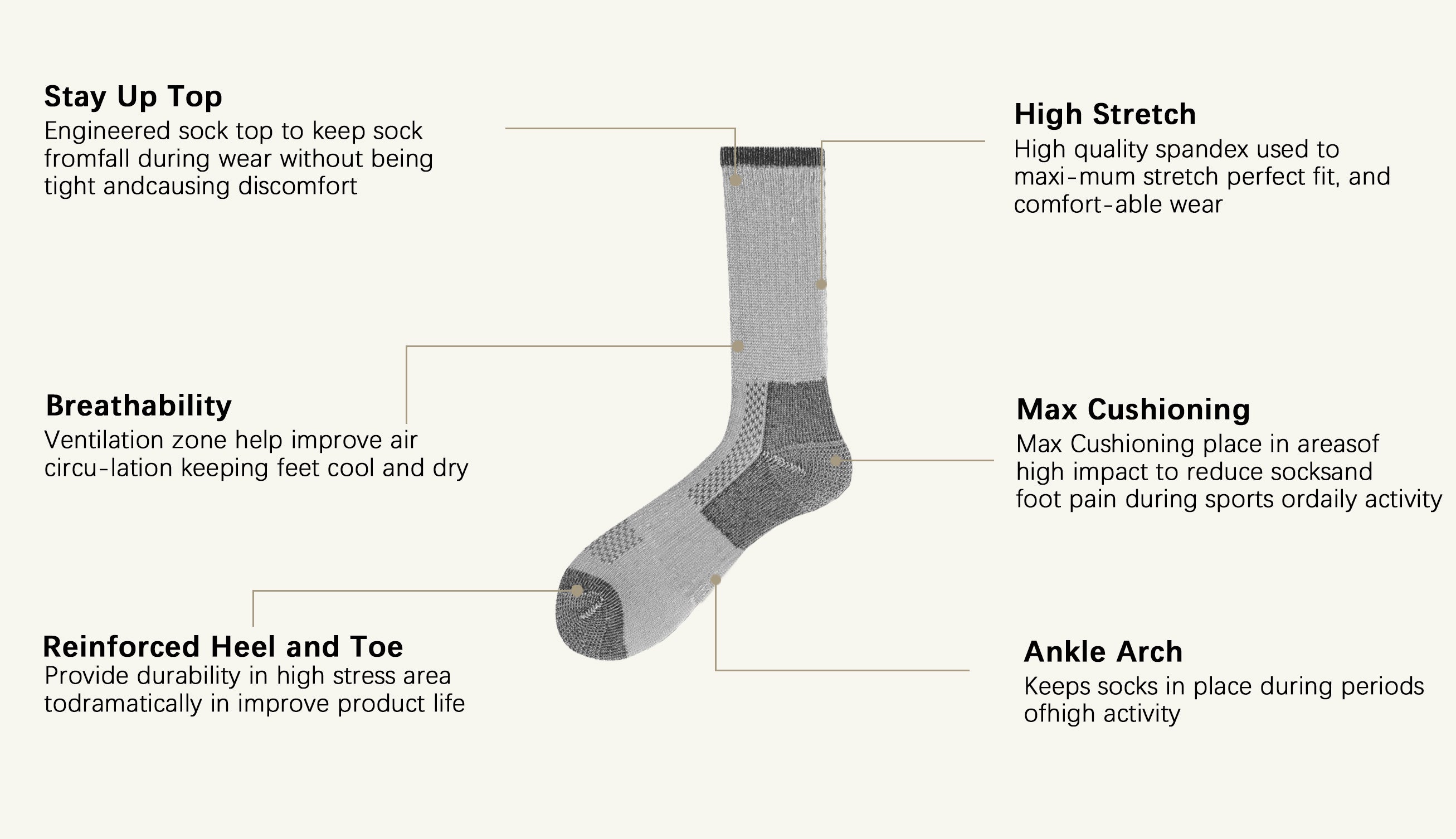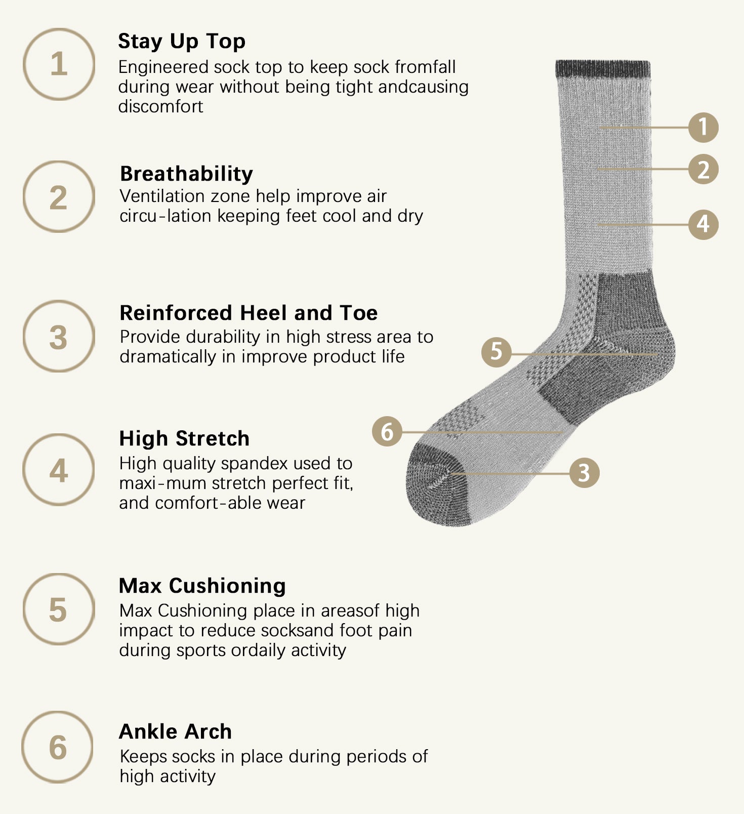 Nos chaussettes en laine sont soigneusement conçues pour s'adapter parfaitement à vos pieds et vous offrir un confort inégalé. Leur technologie de tricotage unique assure un ajustement parfait et réduit les frottements, prévenant ainsi efficacement les ampoules et l'inconfort cutané pouvant survenir en cas de port prolongé. Leur conception anti-plis vous permet de rester au top de votre forme tout au long de la journée, sans vous soucier des plis.